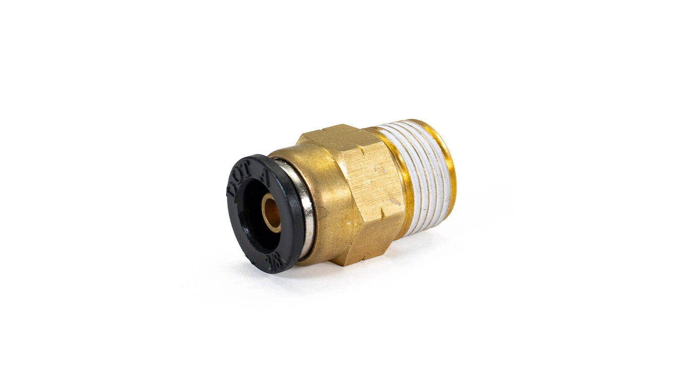 Embrace the ease of pneumatic connections with the HornBlasters 3/8" Male NPT to 3/8" PTC Fitting. This fitting is meticulously designed to provide a hassle-free connection between a 3/8" air line and any 3/8" port, thanks to its 3/8" Male NPT end. It's a DOT-rated fitting, ensuring reliability and safety in your air system connections.