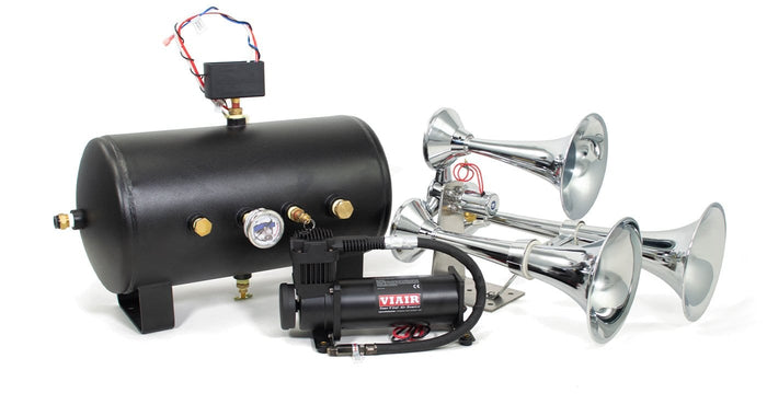 We pair everything up with a black Viair 444K air compressor to make sure your 5-gallon tank stays full with enough air to blast your way past any crowd or get the attention of any distracted driver. The 444K is a real workhorse and will keep your kit running at all times, not to mention handle onboard air duties with ease.